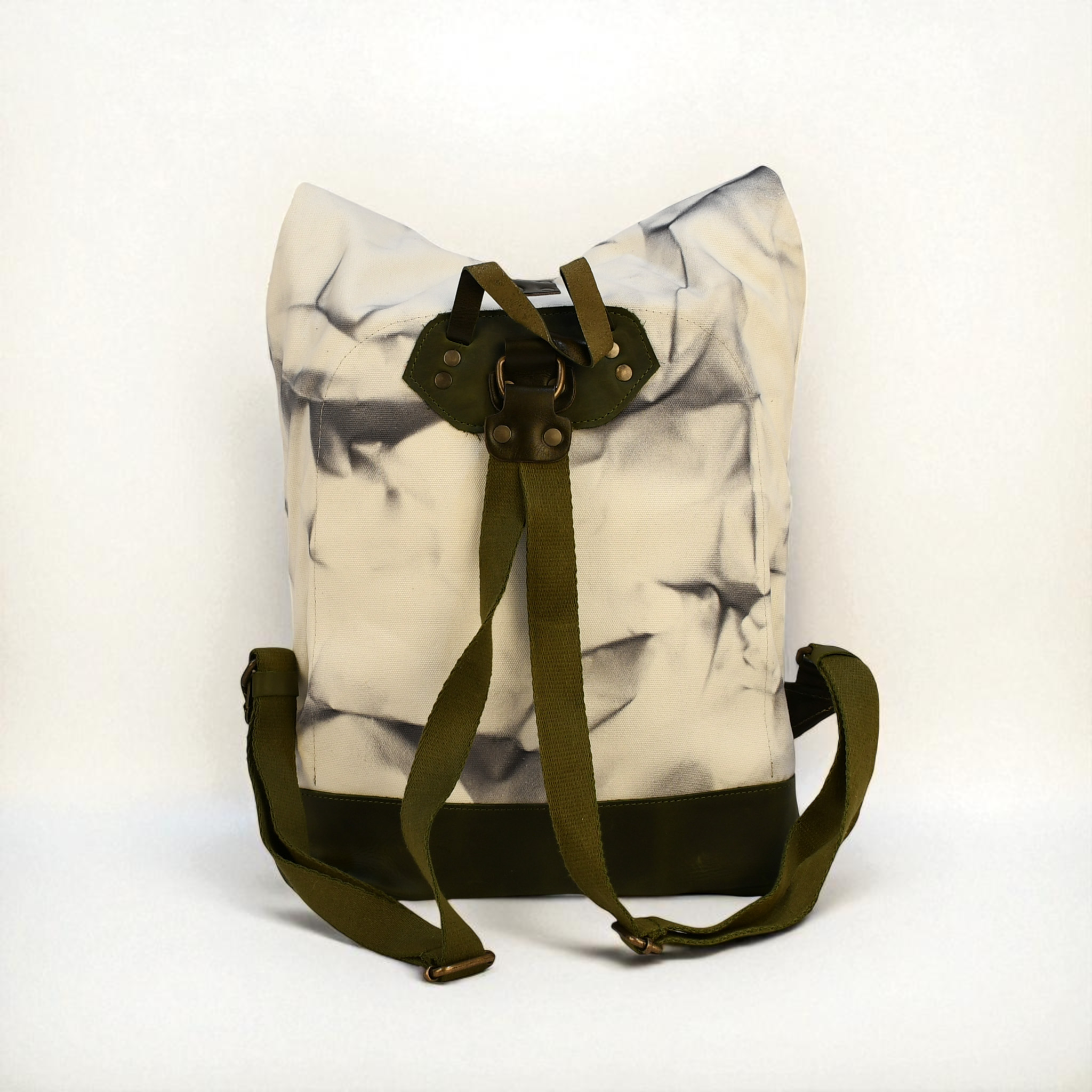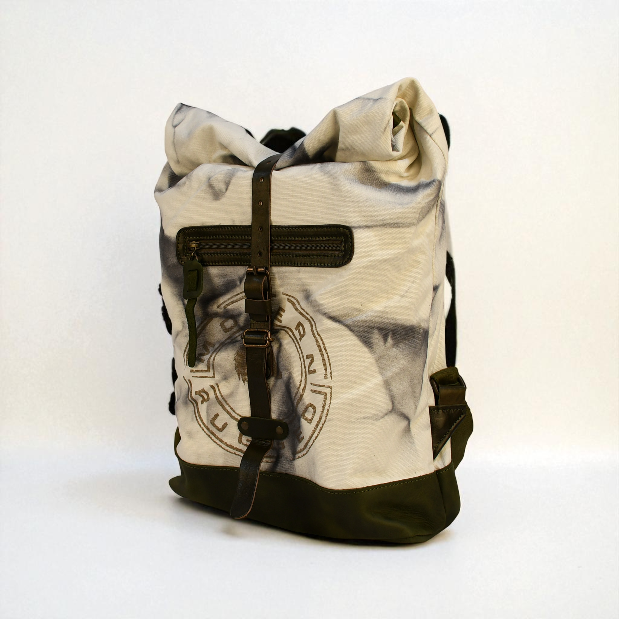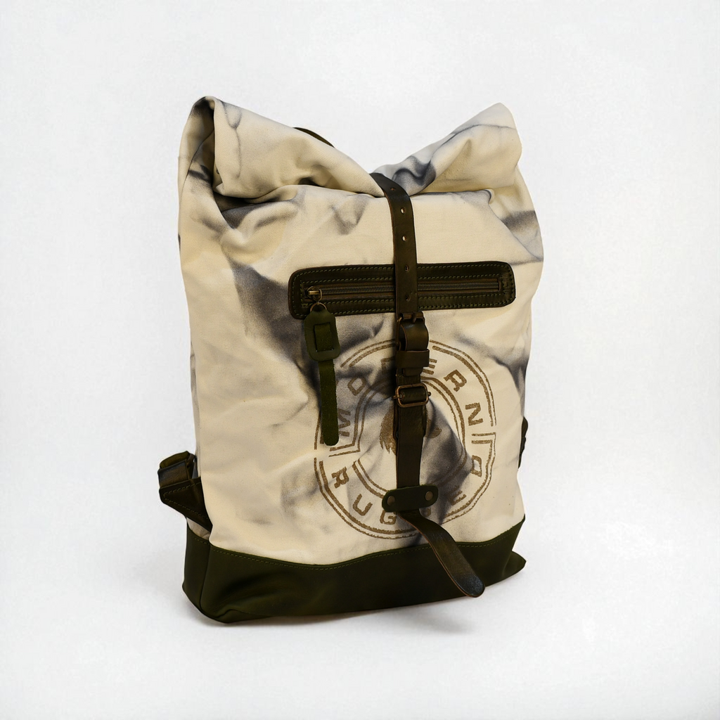 A bold, adventure-ready roll-top backpack featuring our Marbled White canvas. Each pack showcases a unique stone-washed pattern, paired with rich brown leather accents and solid brass hardware for a rugged look that stands out while staying true to the Modern Rugged aesthetic. Built for everyday carry, weekend travel, and the unpredictable path ahead.
