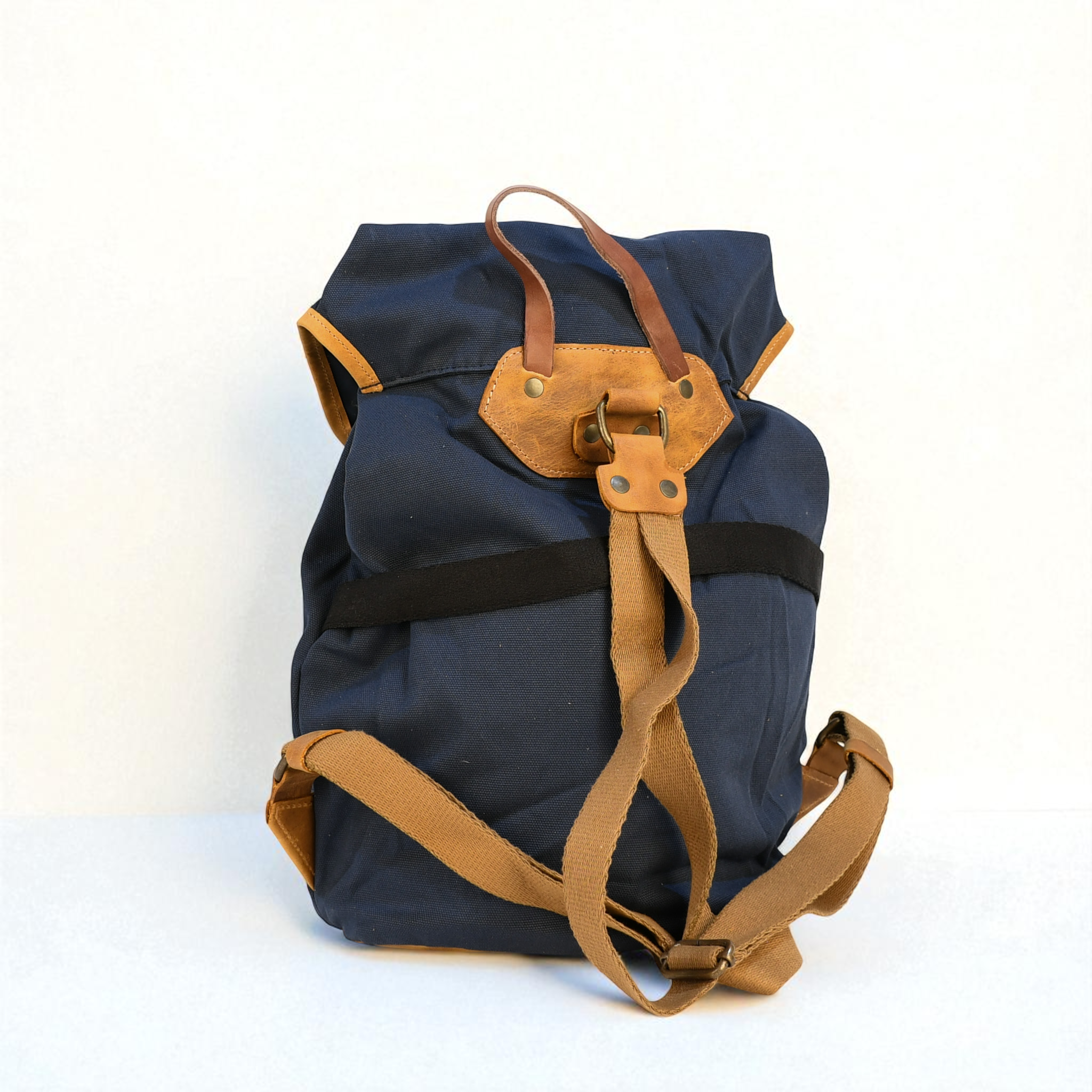 A vintage-inspired canvas backpack built for everyday carry and weekend adventure. Crafted from heavy-duty navy canvas with genuine brown leather accents and solid brass hardware, this pack combines classic style with rugged durability.