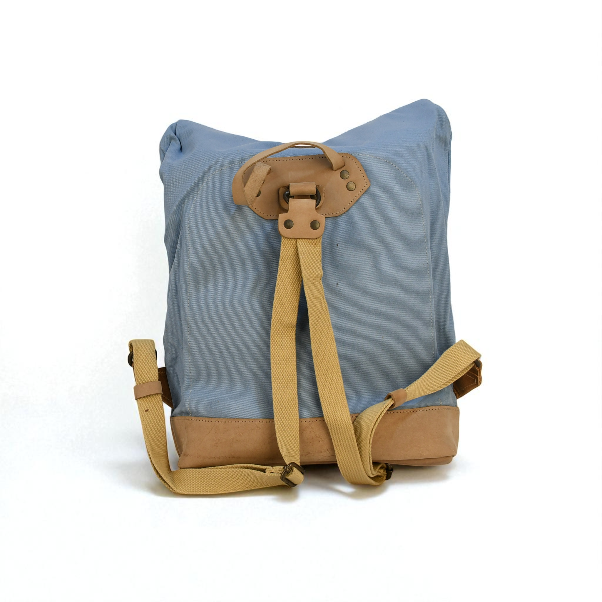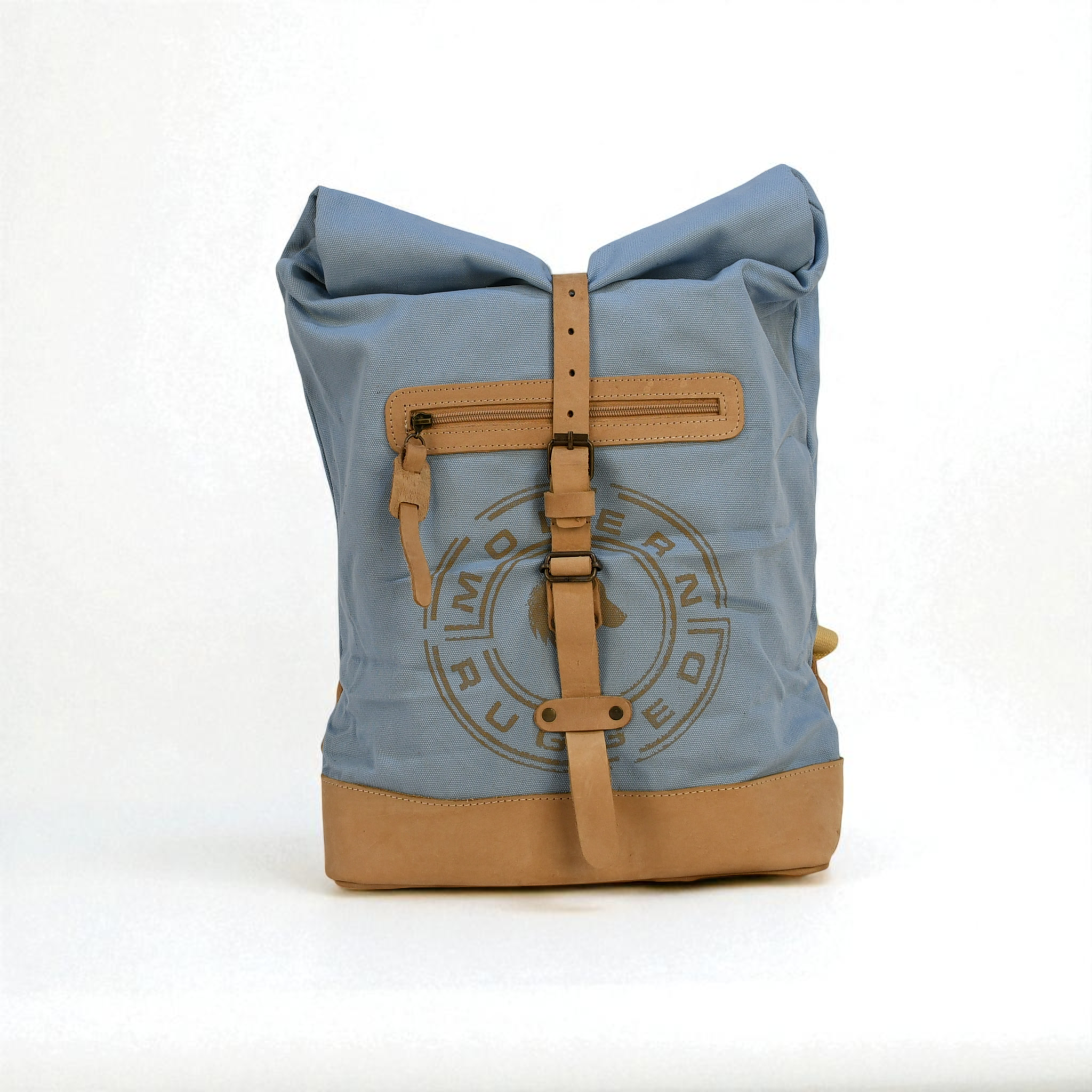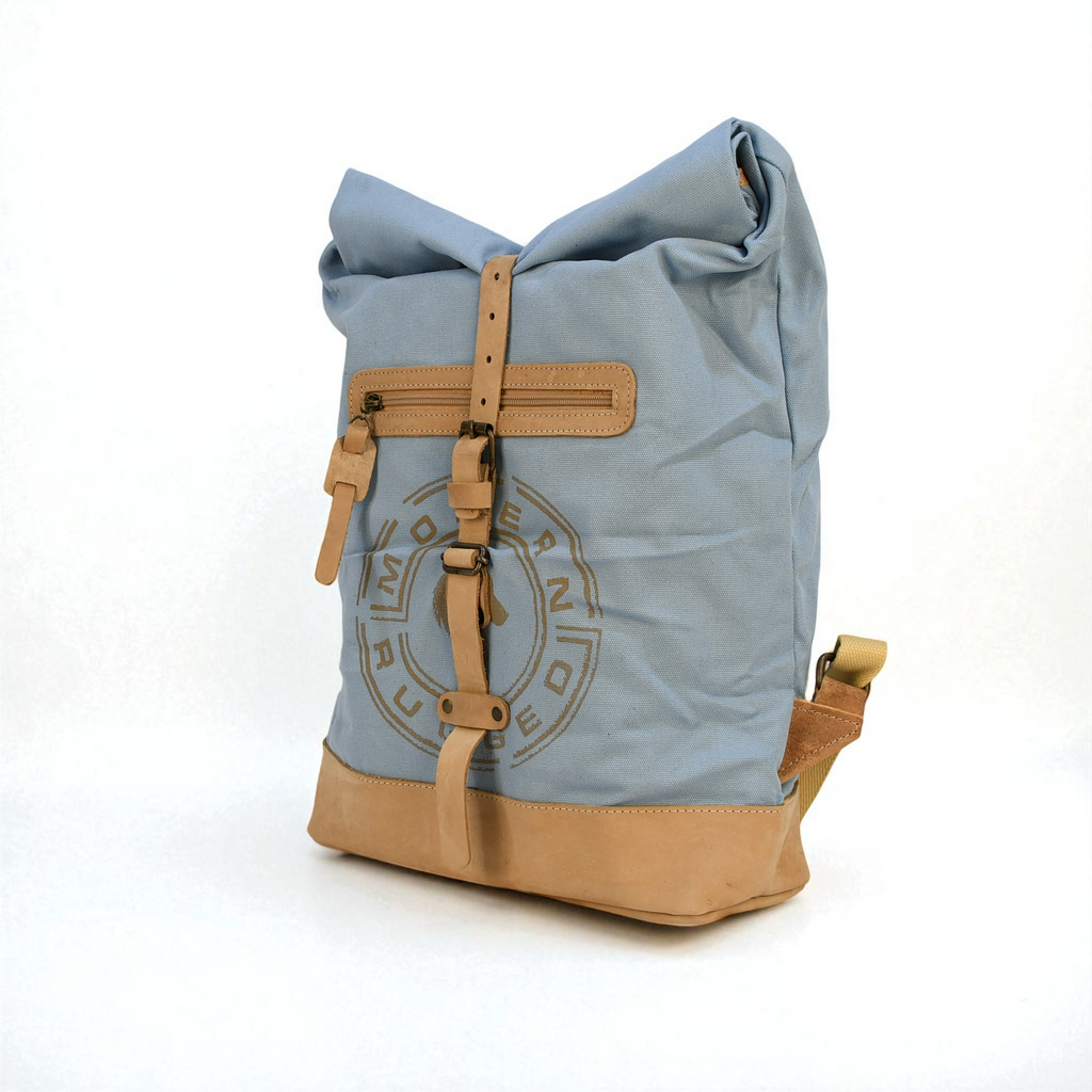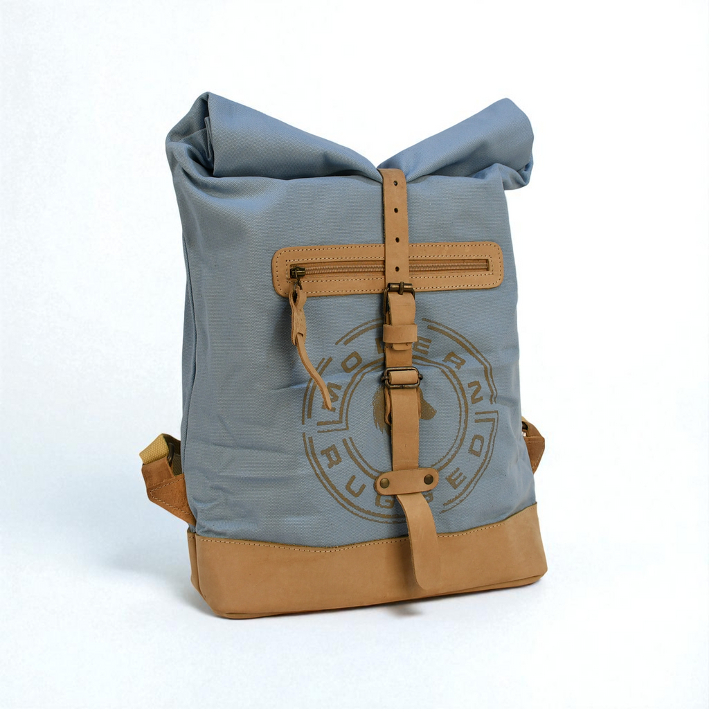 A bold take on a classic roll-top silhouette. This Powder Blue canvas pack features tan leather accents, brass hardware, and a rugged finish that stands out while staying durable, functional, and adventure-ready.