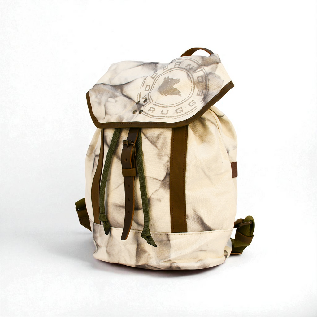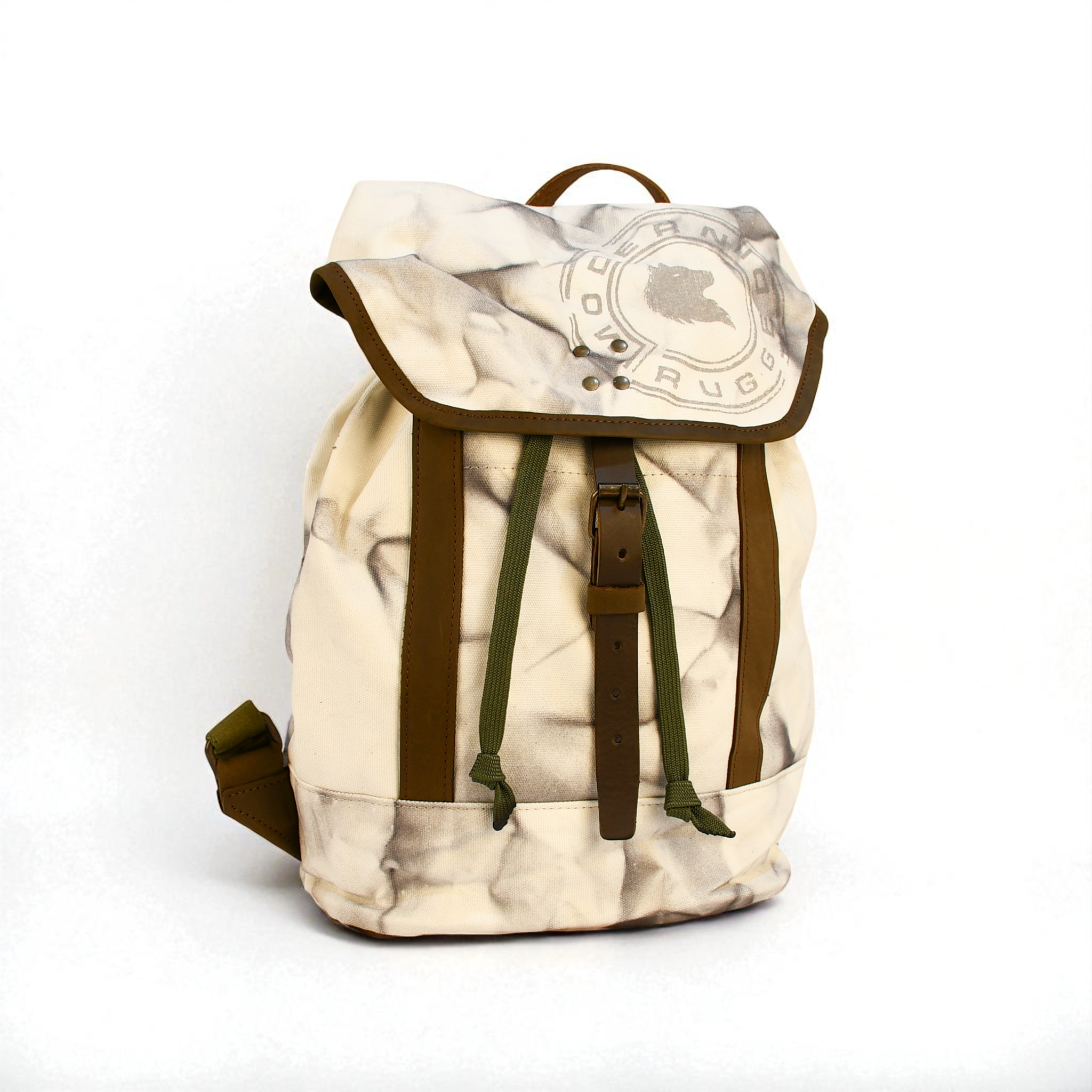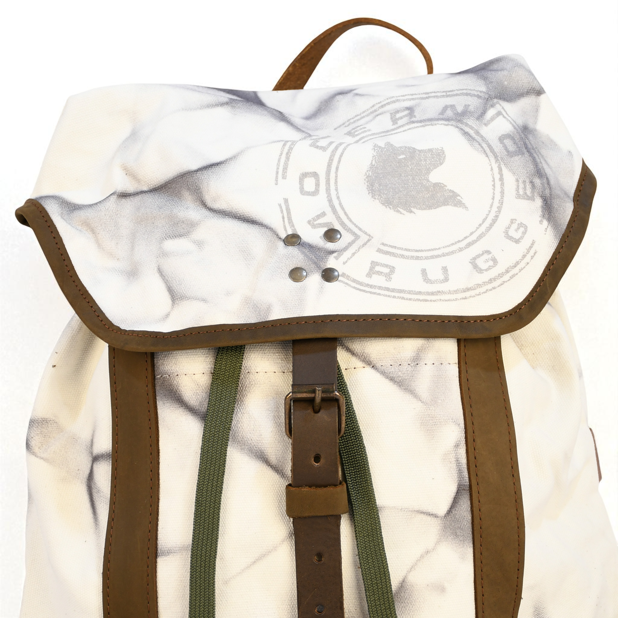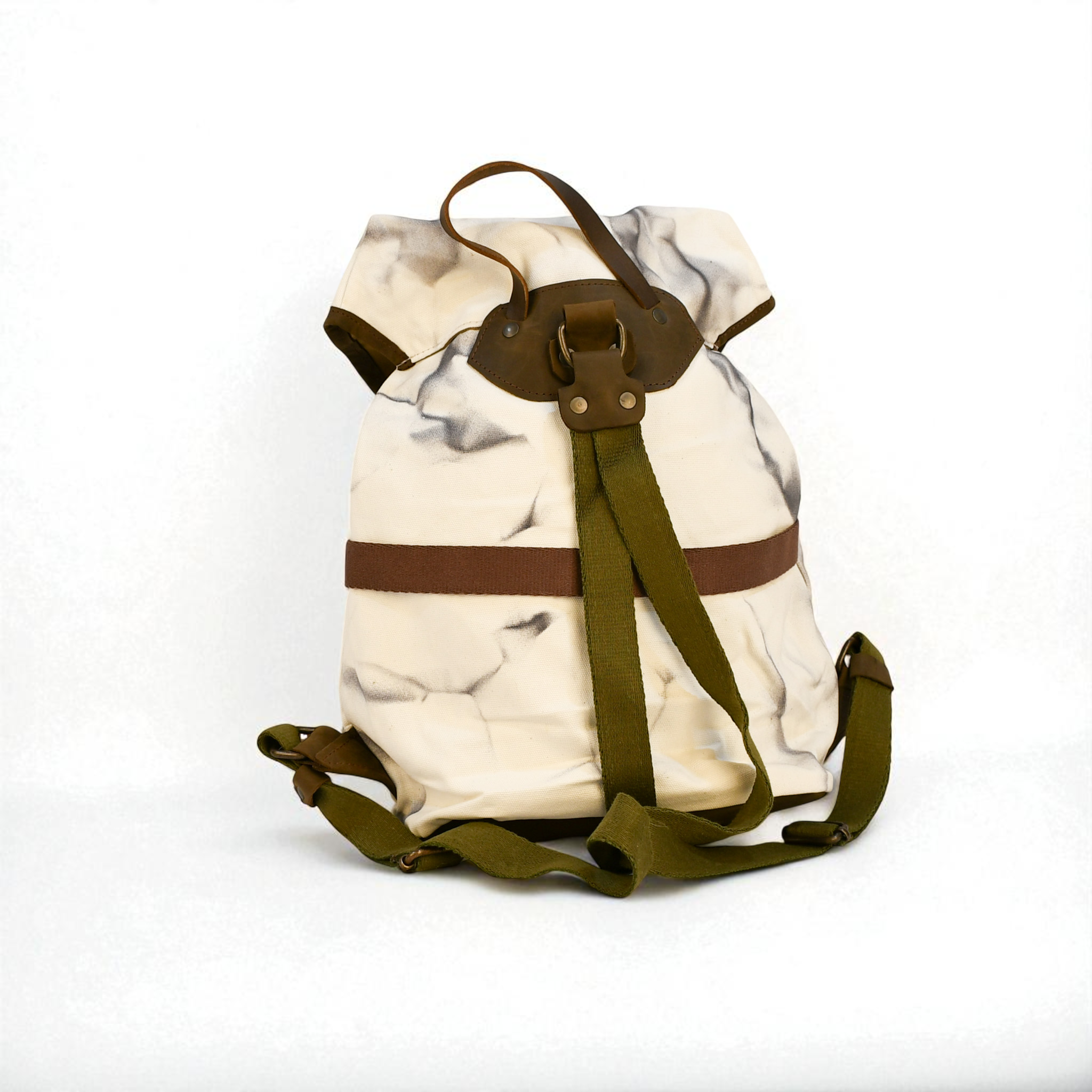 A vintage-inspired canvas backpack built for everyday carry and weekend adventure. Crafted from heavy-duty marbled white canvas with genuine dark brown leather accents and solid brass hardware, this pack combines classic style with rugged durability.